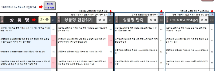 위쪽에 단어개수 입력 또는 상품명 길이 글자수는 원하는 숫자를 넣고 변경버튼을 누르면 상품명이 숫자에 따라 변경되는 걸 확인할 수 있습니다.